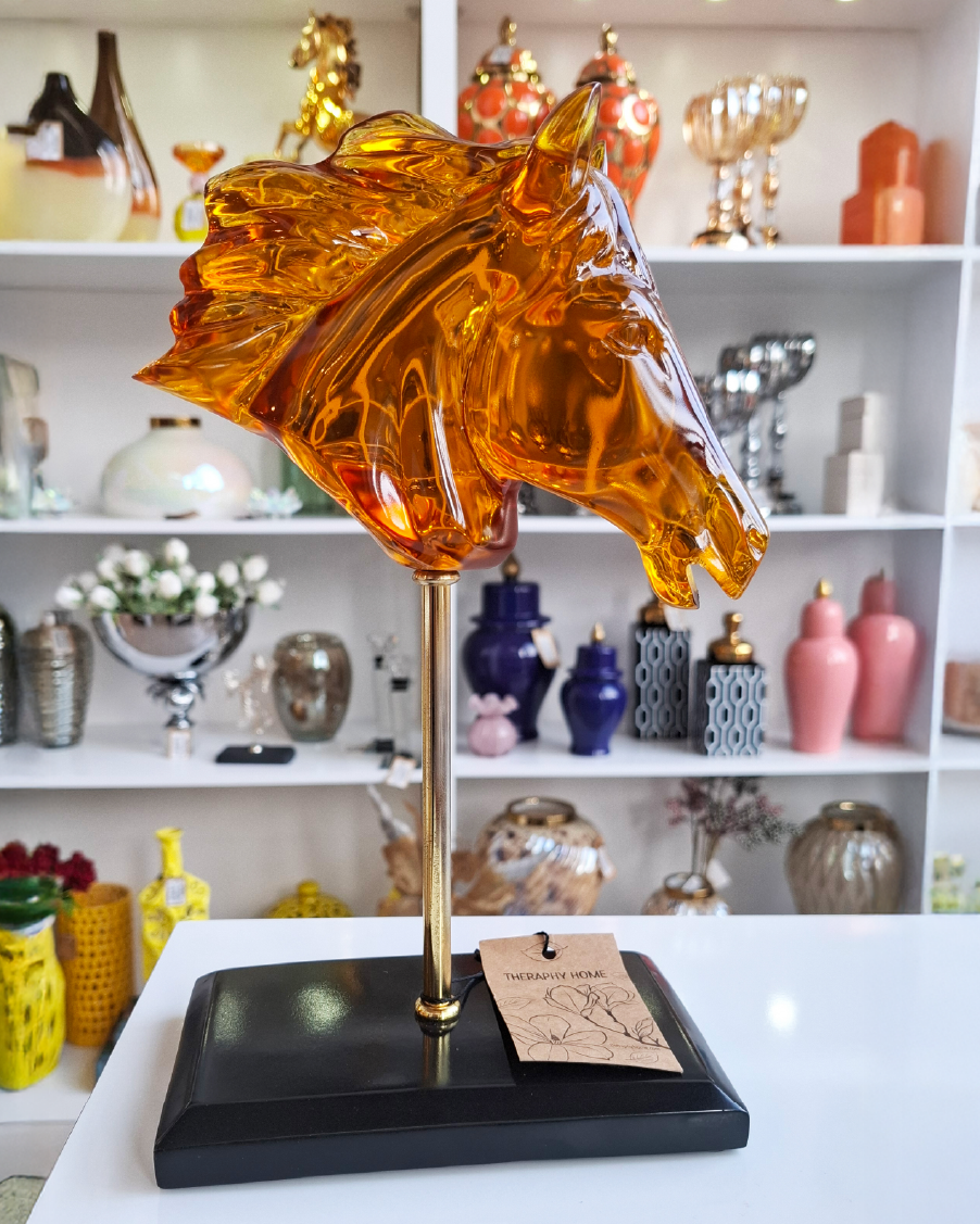 Zarif formuyla dikkat çeken bu dekoratif at figürü, el işçiliğiyle şekillendirilmiş cam yapısı sayesinde bulunduğu alanda güçlü bir estetik vurgu oluşturur. Işığı kıran akıcı hatları, hem modern hem de klasik dekorasyon stilleriyle uyum sağlayan sofistike bir görünüm sunar.