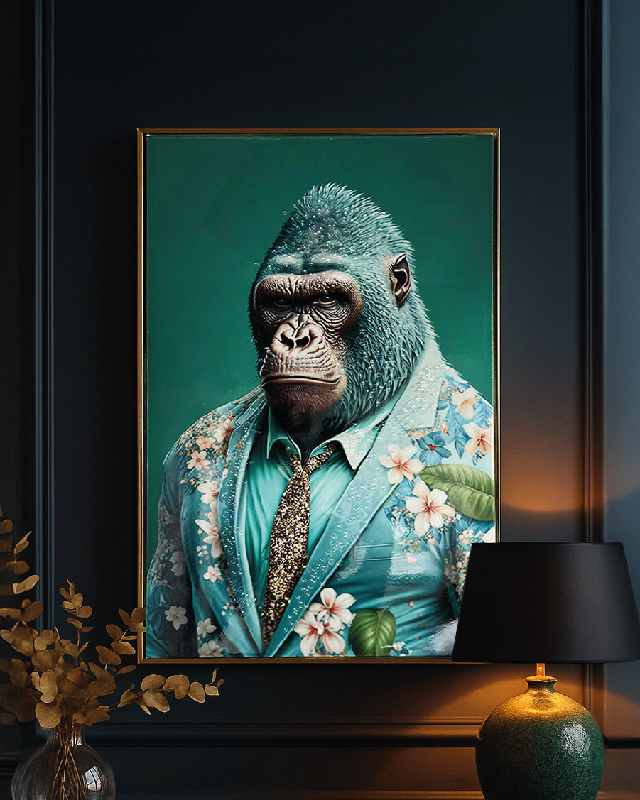 Bu tablo, sanatı ve modern lüksü bir araya getiriyor: kanvas üzerine özenle hazırlanmış goril portresi, epoksi kaplama sayesinde parlak ve derin bir görünüm sunar. Çiçek desenli takım elbisesi, yeşil tonlu arka planı ve altın detaylı kravatıyla güçlü bir kontrast oluşturur. Tablo üzerindeki taşlı efektler, üç boyutlu bir görünüm katarak adeta canlı bir sanat eseri hissi verir.
