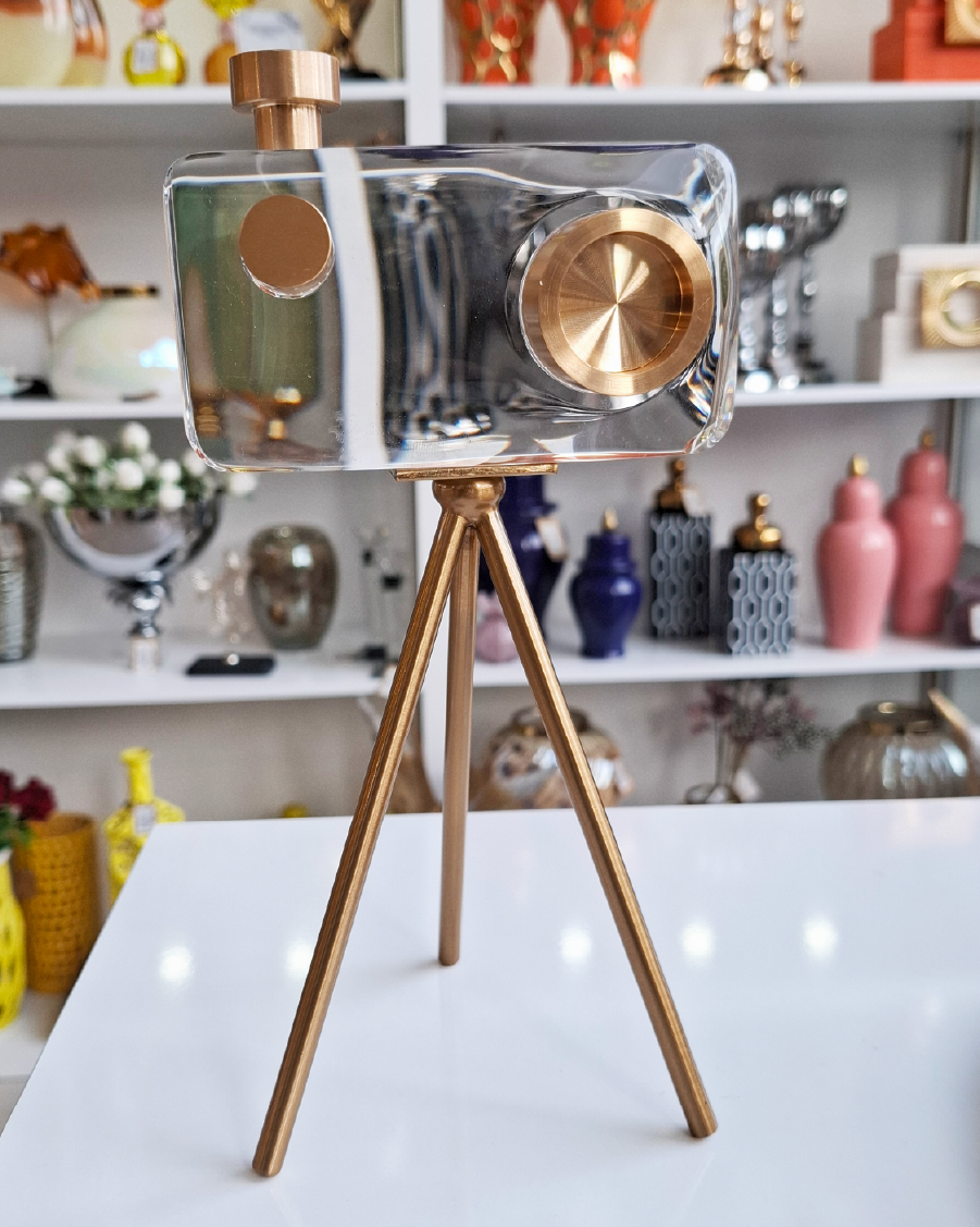 Fotoğrafçılığın nostaljik ruhunu modern zarafetle buluşturan Ayaklı Kristal Cam Fotoğraf Makinesi Dekoratif Obje, estetik duygusu güçlü olanlar için eşsiz bir tamamlayıcı parça sunuyor.