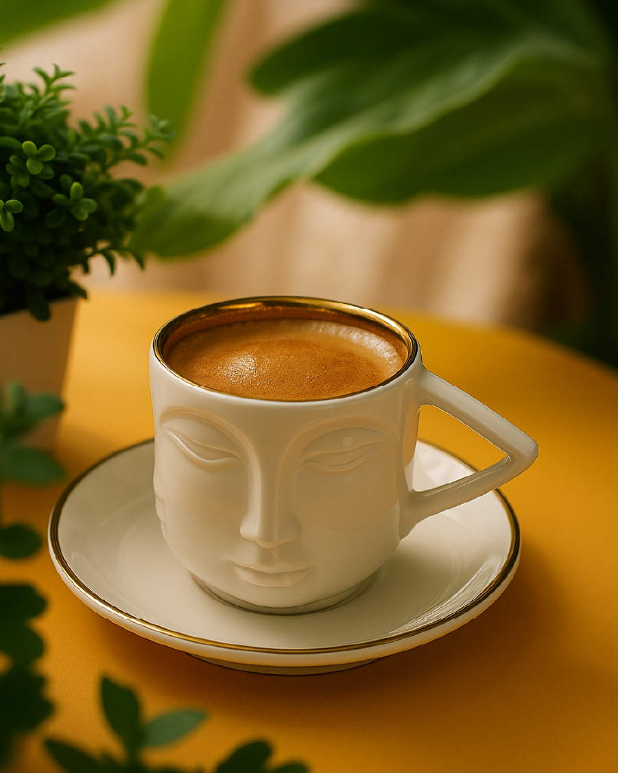 Muse Face 6’lı Fincan Seti, modern sanatın yalın çizgilerini günlük yaşamın zarafetiyle buluşturuyor. Her bir fincan, heykelsi yüz formu ve altın yaldızlı detaylarıyla hem dekoratif hem de işlevsel bir obje olarak öne çıkar.