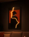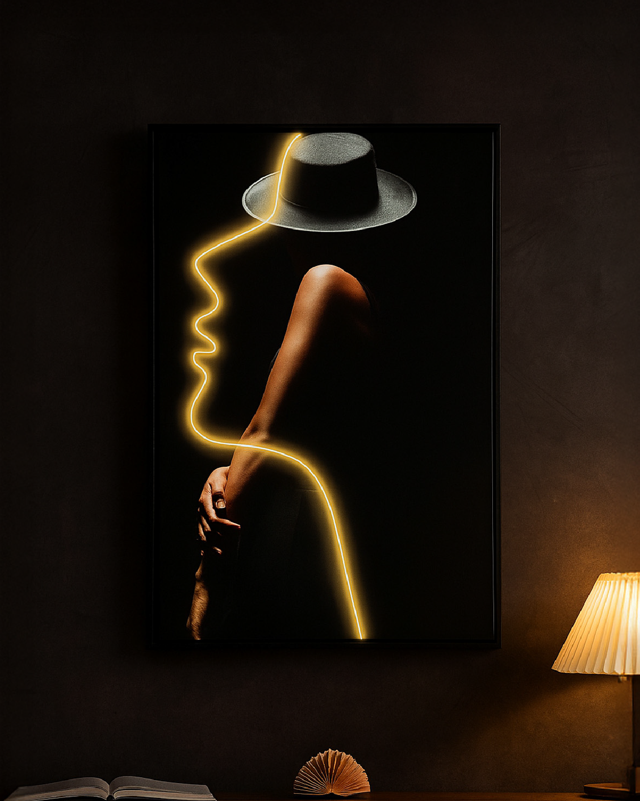 Noira LED Tablo , ışık ve gölgenin gizemini modern dekorasyona taşıyan özel bir parçadır. Şapkalı silüeti çevreleyen altın LED ışık hattı tabloya derinlik katarken, epoksi taş işlemeleri sanatsal bir zarafet ekler.
