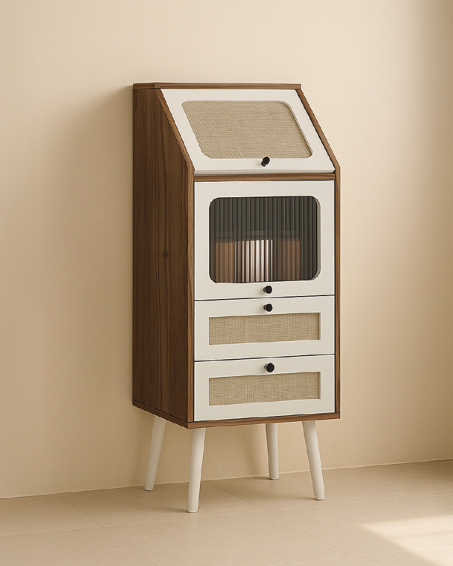 Rattan dokusunun zamansız estetiği, ahşap gövde ile birleşerek mutfaktan salona, yatak odasından antreye kadar her alana uyum sağlar.