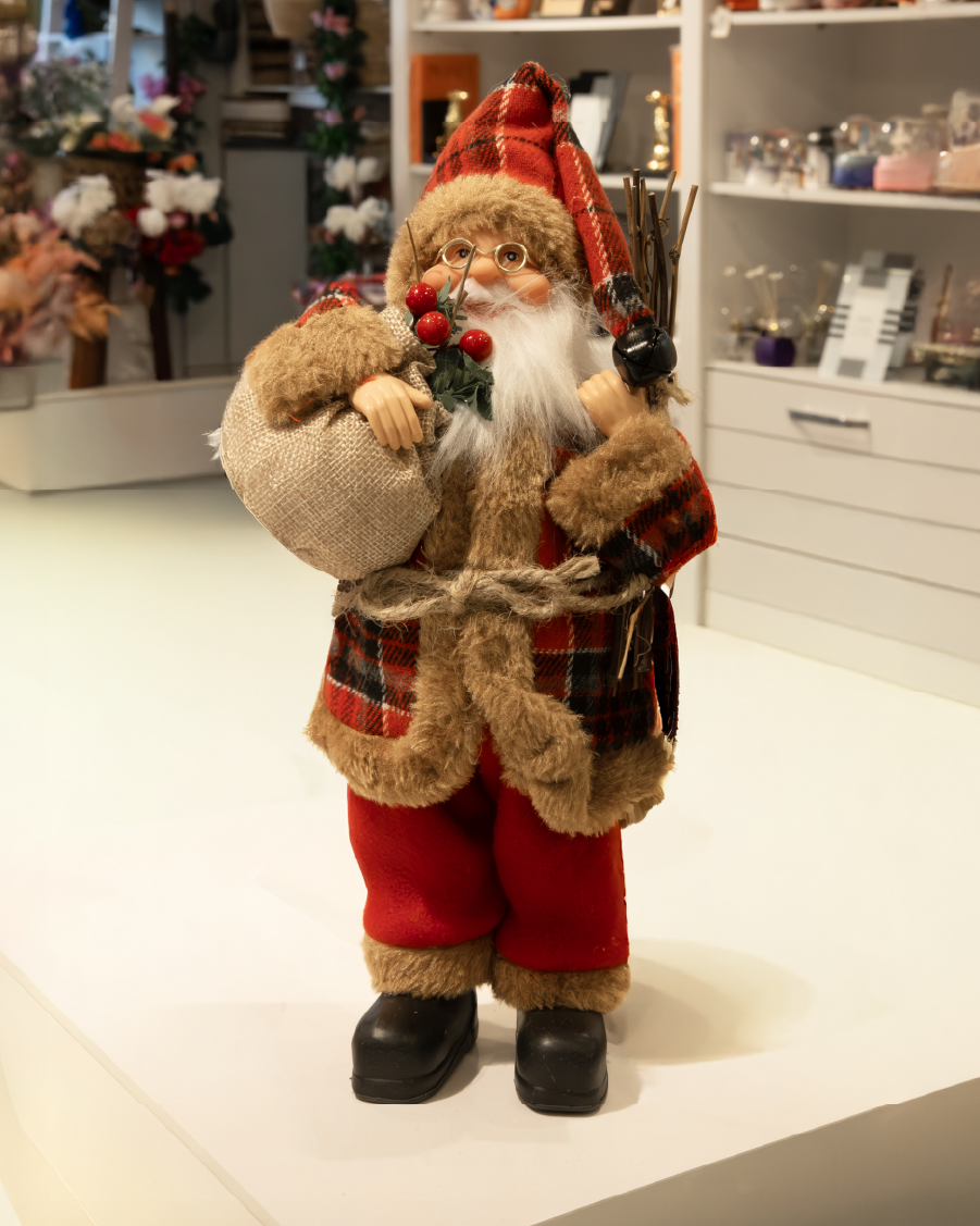 Klasik kırmızı tonları, kumaş dokulu kıyafeti ve elde taşıdığı aksesuarlarla hem vitrin düzenlemelerinde hem de ev dekorasyonunda dikkat çeken şık bir tamamlayıcıdır.Salon, giriş alanı, vitrin veya yılbaşı köşesi için mükemmel bir dekoratif figürdür.