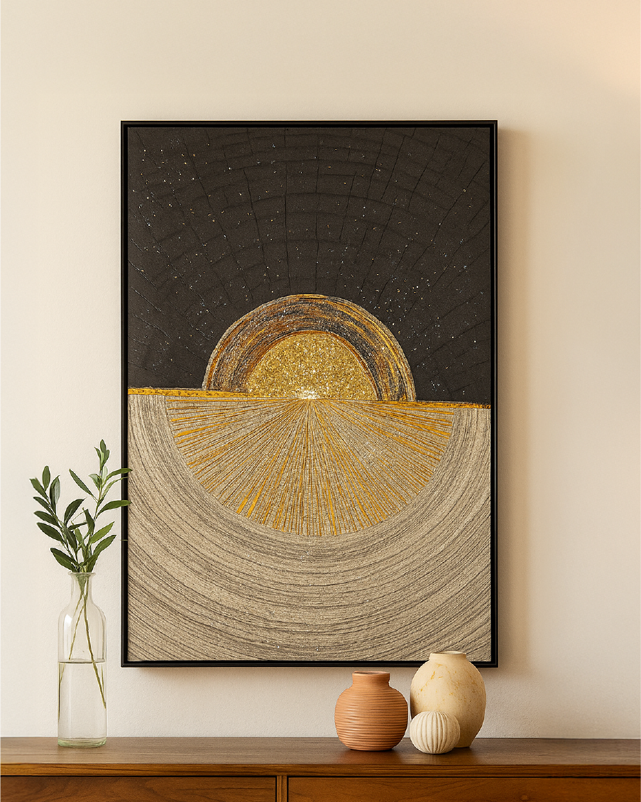Sunlight – Epoksi Taş İşlemeli Modern Tablo, doğan güneşin zarif ışığını modern sanat estetiğiyle birleştirir.Koyu fon üzerinde yükselen altın yansımalar, epoksi kaplama ile tabloya parlaklık ve derinlik kazandırır.Taş işlemeli yüzey dokusu, ışığın doğal yansımalarını taklit ederek üç boyutlu bir etki oluşturur.El işçiliğiyle tasarlanan Sunlight, salon, ofis, oturma odası ve giriş alanlarında zarif bir odak noktası yaratır. Sıcak renk tonlarıyla yaşam alanlarına enerji, huzur ve estetik bir bütünlük katar.