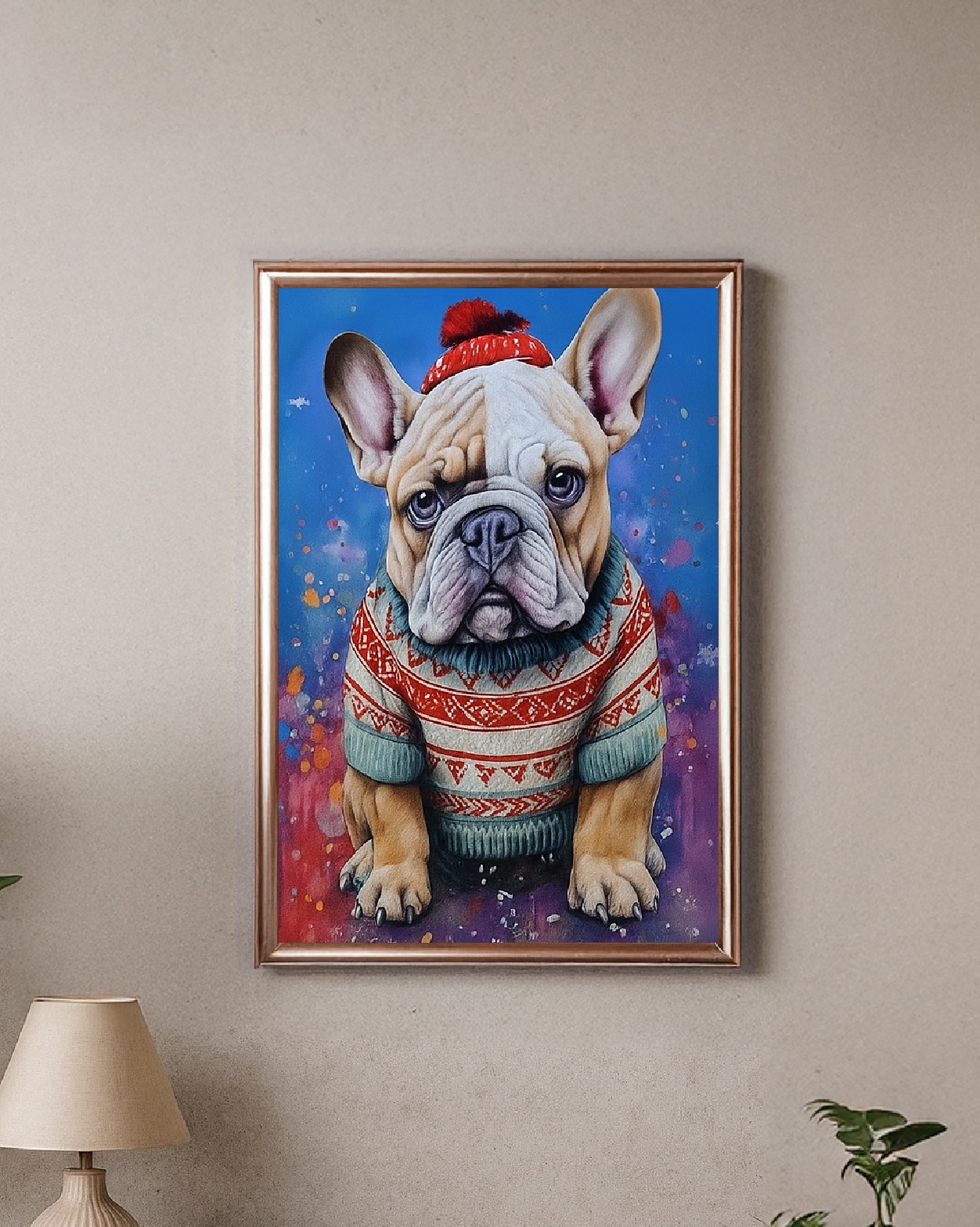 Winter Buddy Sanat Tablosu , kazak ve kırmızı bere giymiş sevimli bulldog tasarımıyla yaşam alanlarına samimi bir atmosfer kazandırır. Canlı renkleri ve eğlenceli detayları sayesinde hem yetişkin hem de çocuk odalarında keyifli bir dekorasyon parçası olur.